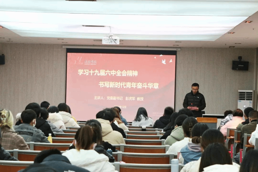 为引导广大师生深刻领会十九届六中全会精神的丰富内涵和思想精髓,营造学习全会精神的浓厚氛围,12月8日,党委副书记彭虎军以党委党史学习教育宣讲团成员的身份深入我院,在丹江校区报告厅为我院师生宣讲党的十九届六中全会精神。院党总支副书记赵永平主持宣讲会,学院各党支部委员会成员、全体辅导员、学生党员、学生代表90余人聆听宣讲。