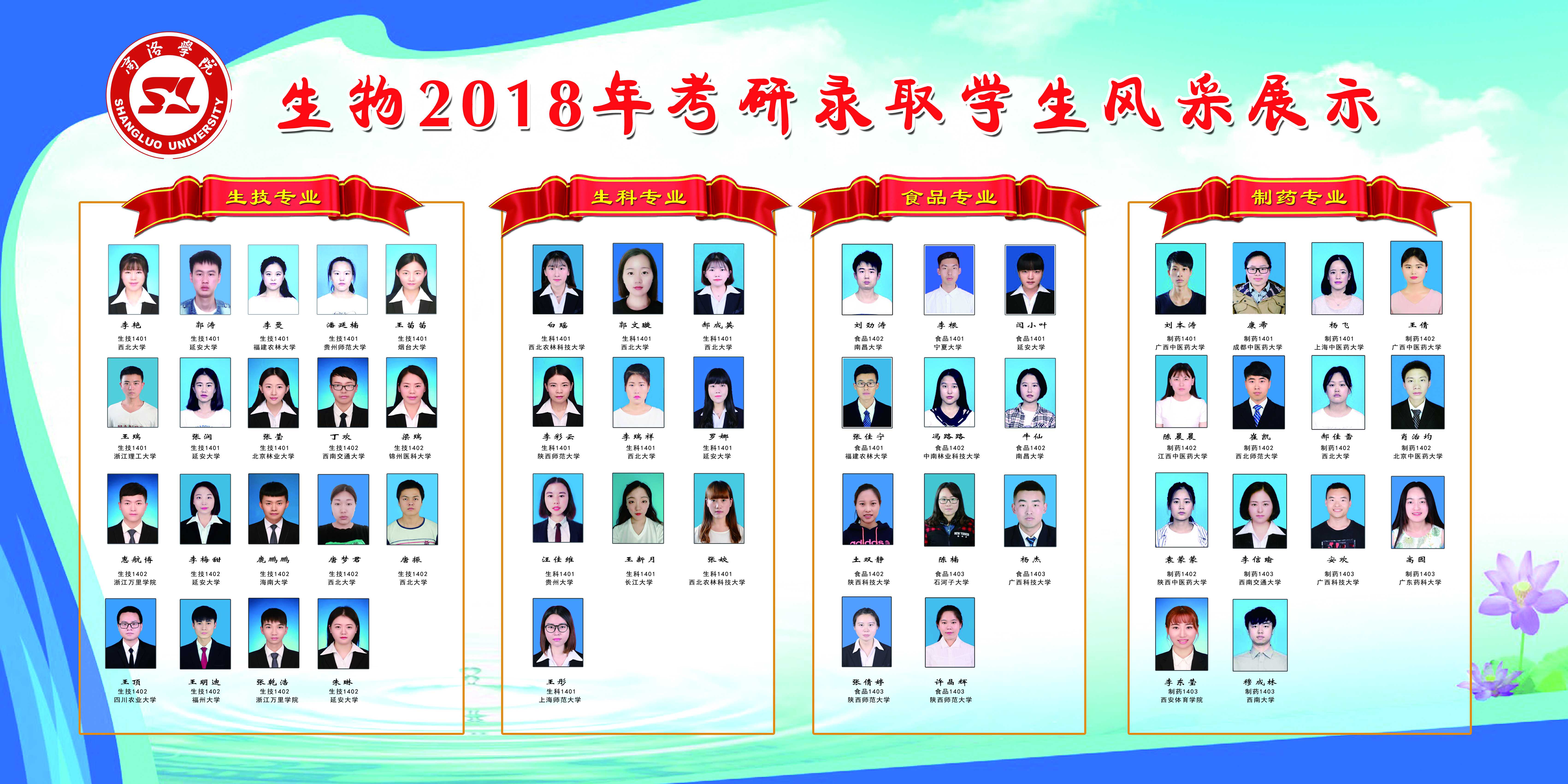 我院2018届毕业生共274人,在2018年全国硕士研究生入学考试中,共66人总分达到国家线标准,上线率达24.09%,最终有54人被北京中医药大学、西北农林科技大学、陕西师范大学、上海中医药大学等省内外知名大学录取,录取率为81.82%。